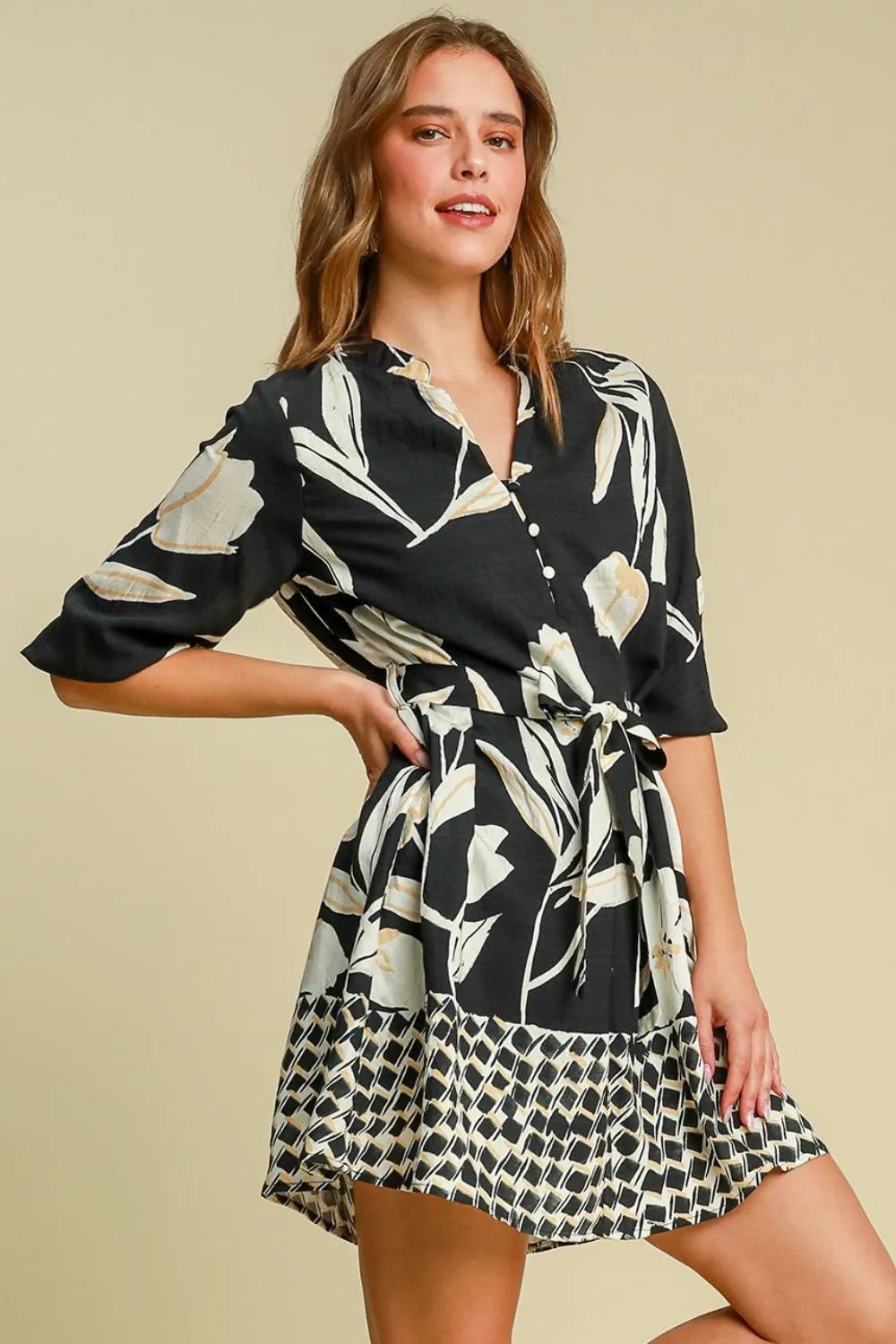 Umgee Full Size Floral Print Notched Tie Waist Mini Dress Plus Size