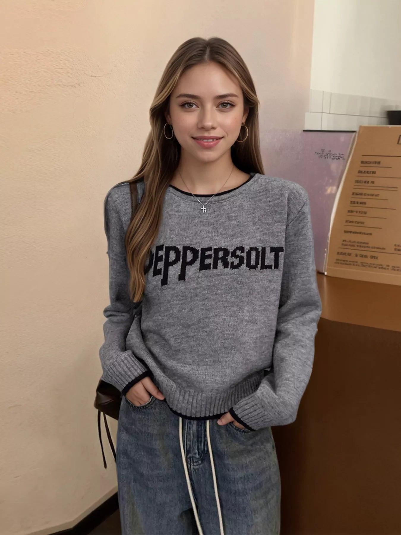 Letter Contrast Trim Round Neck Sweater